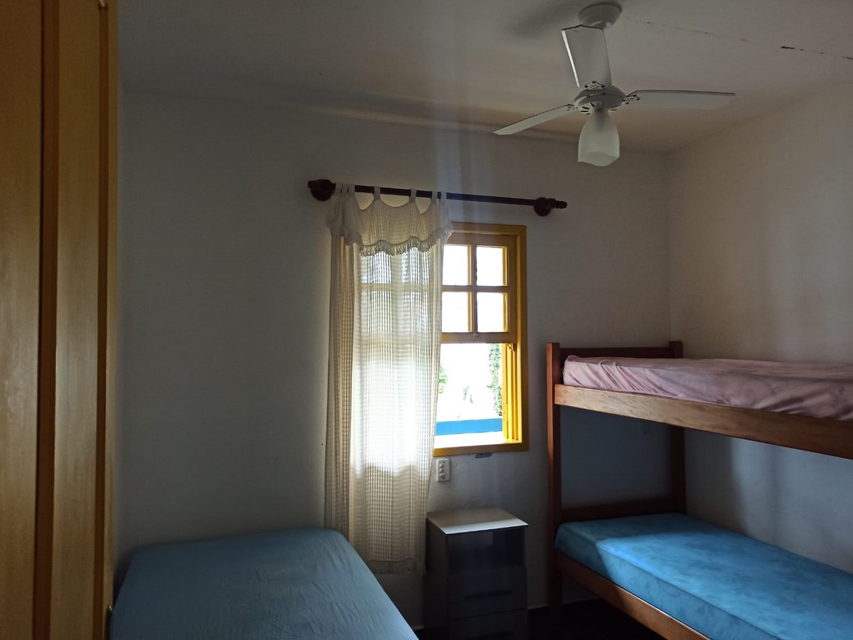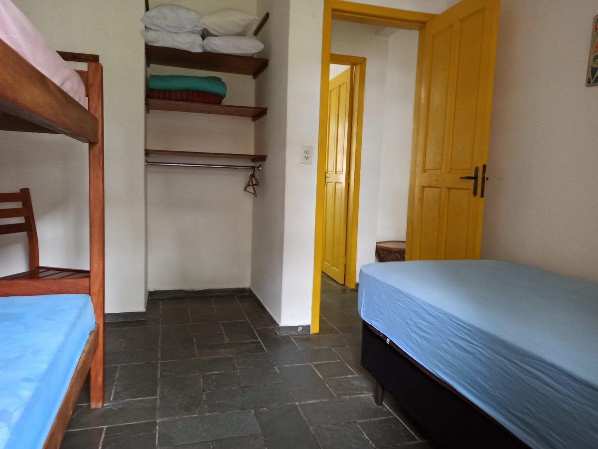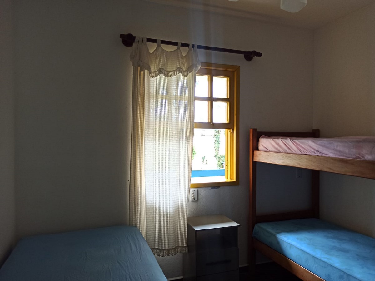 Um quarto com cama de casal BOX com AR CONDICIONADO, e no outro quarto um beliche e uma cama individual com ventilador de teto. Cozinha com fogão, geladeira, microondas, liquidificador, novos acessórios de cozinha, pátio (piso térreo) ou varanda (primer andar), com tanque de lavar e uma churrasqueira privativa com espetos e grelha. Sala de TV com 32" smart HD com sofá-cama para 1 adulto. Capacidade máxima: 6 pessoas